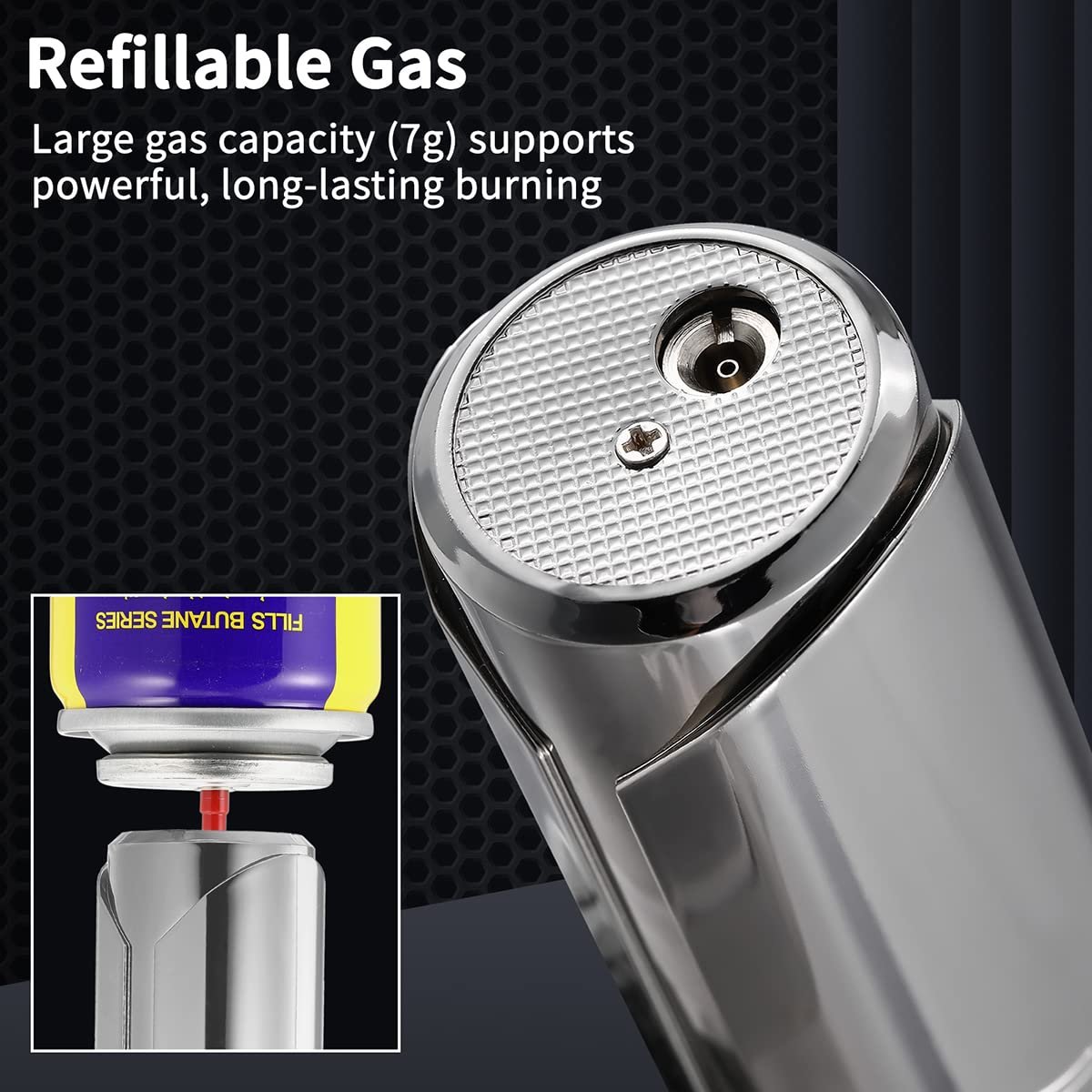 🔁 Refillable & Efficient: Refills in just 8 seconds with up to 7g gas. Note: Lighter is shipped empty due to shipping rules. Use a long-nozzle butane canister for best results.